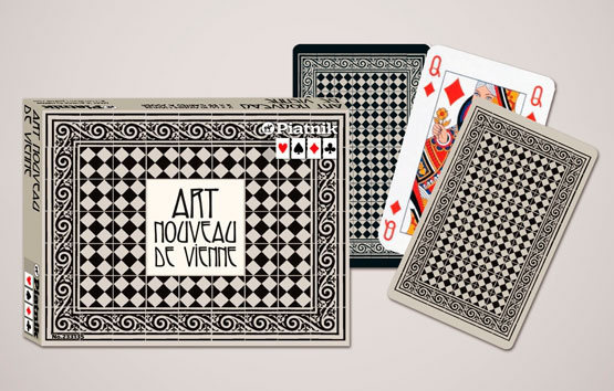 Doppelspiel von Piatnik Rückseite gestaltet, Vorderseite moderner Standard mit 4 Eckzeichen, 2 x 55 Spielkarten, 6 Joker, Kartengrösse 58 x 89 mm