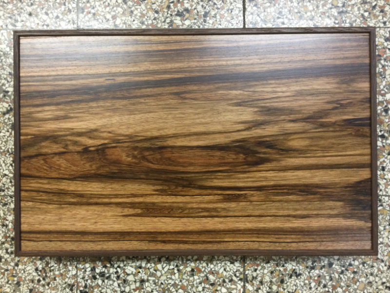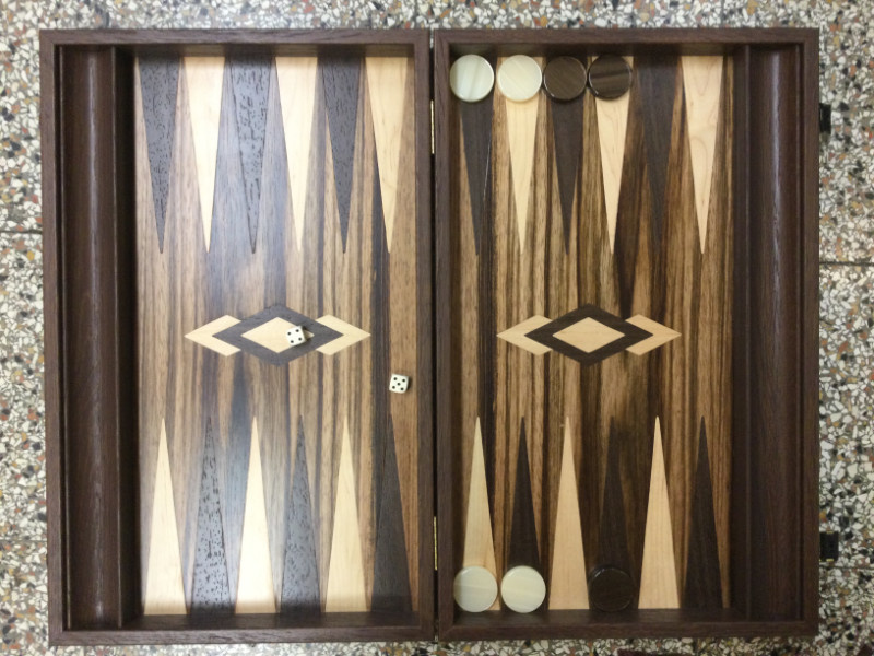 Backgammon, Mango Furnier, Points Wenge & Eiche, mit Seitenablage, circa 2,8kg, mit 30 Acryl - Perlmutt Spielsteine, 4 6-Seitige Würfel und 1 Dopplerwürfel,