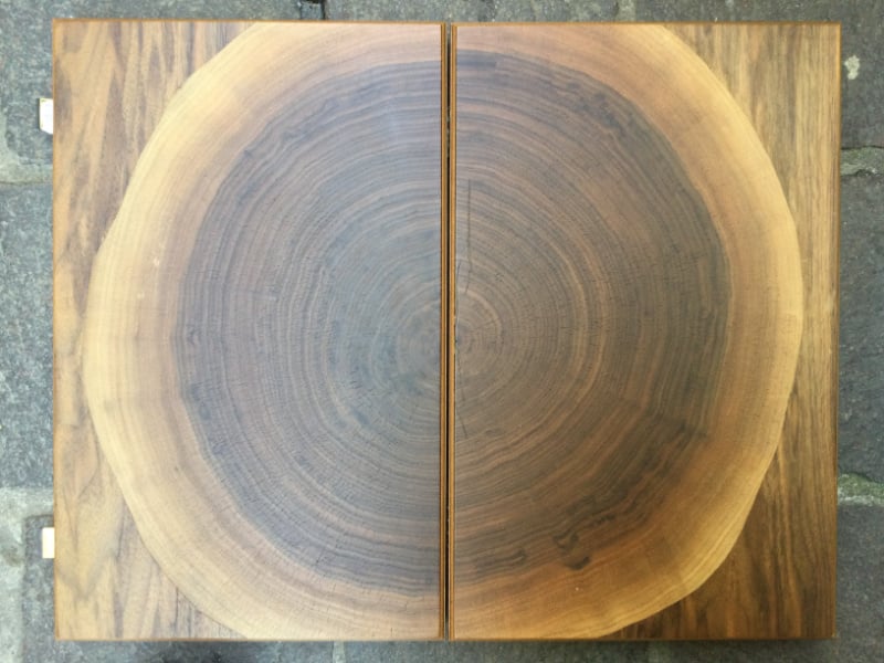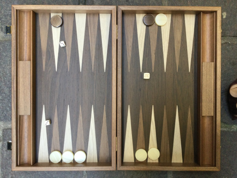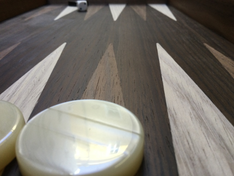 Backgammon, Walnussstamm Querschnitt Furnier, Points Walnuss & Eiche, mit Seitenablage, circa 2,8kg, mit 30 Acryl - Perlmutt Spielsteine, 4 6-Seitige Würfel und 1 Dopplerwürfel