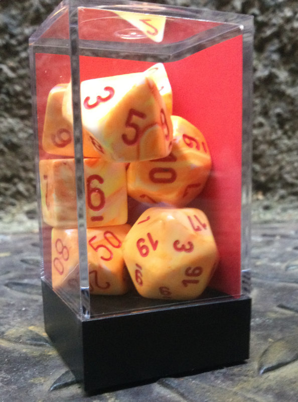 7 verschiedene, mehrseitige Würfel, d4, d6, d8, d10, d00, d12, d20, in Kunststoffbox