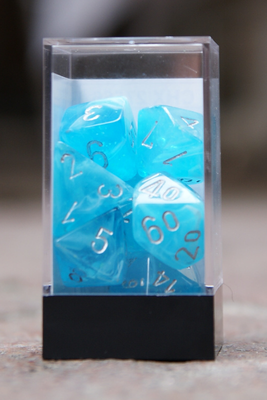7 verschiedene, mehrseitige Würfel, d4, d6, d8, d10, d00, d12, d20, in Kunststoffbox