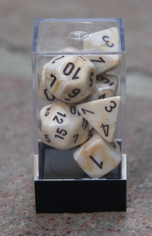 Marmor Elfenbeinfarbig, 7 verschiedene, mehrseitige Würfel, d4, d6, d8, d10, d00, d12, d20, in Kunststoffbox