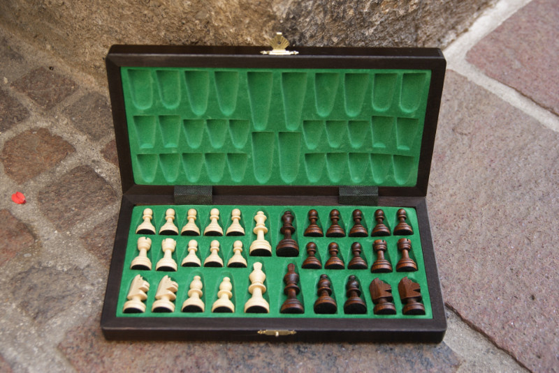 Schach magnetisch, 28 x 28 x 2cm aufgeklappt, zusammengeklappt 28 x 14 x 4 cm, Farbe braun, Brett aus Buche, Figuren im Staunton Stil aus Hainbuche, Innenablage für die Figuren.