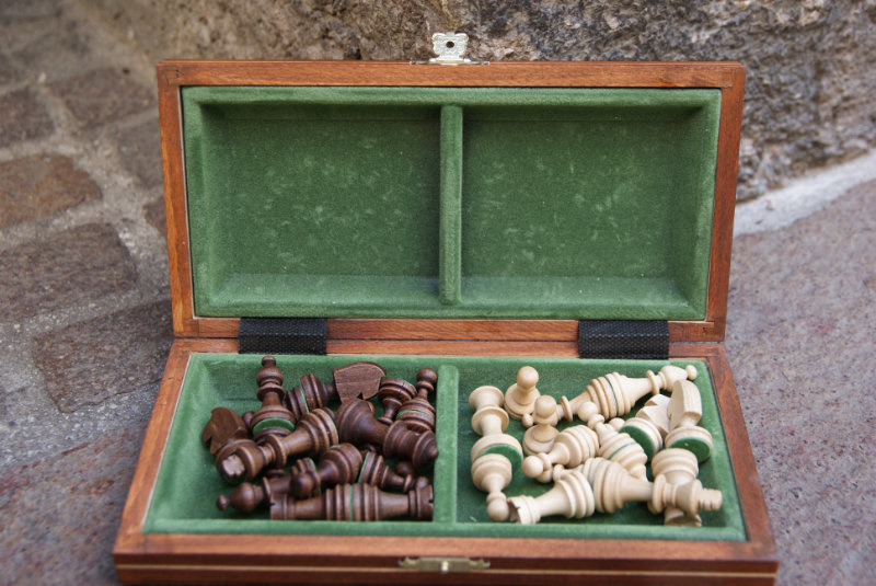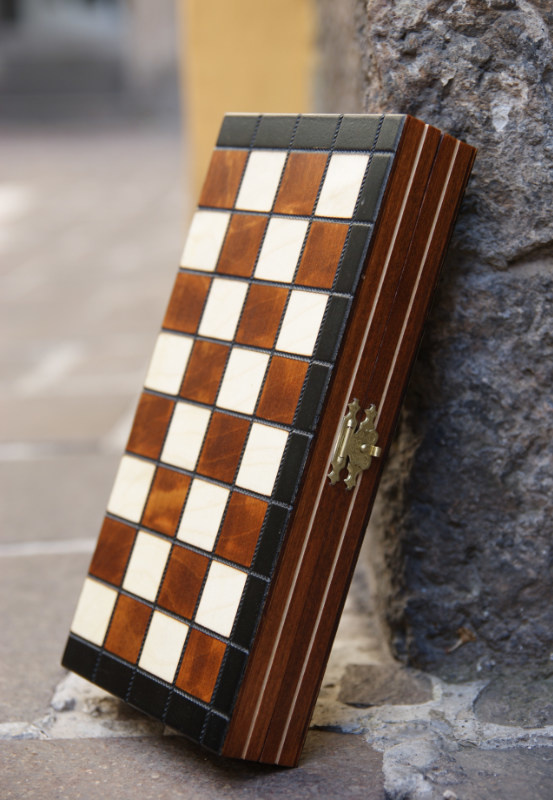 Schach magnetisch „mini“, zusammengeklappt 220x110x40 cm, braun, Brett aus Buche, Figuren im Staunton Stil aus Hainbuche, Ablage in der Box, ohne Notation