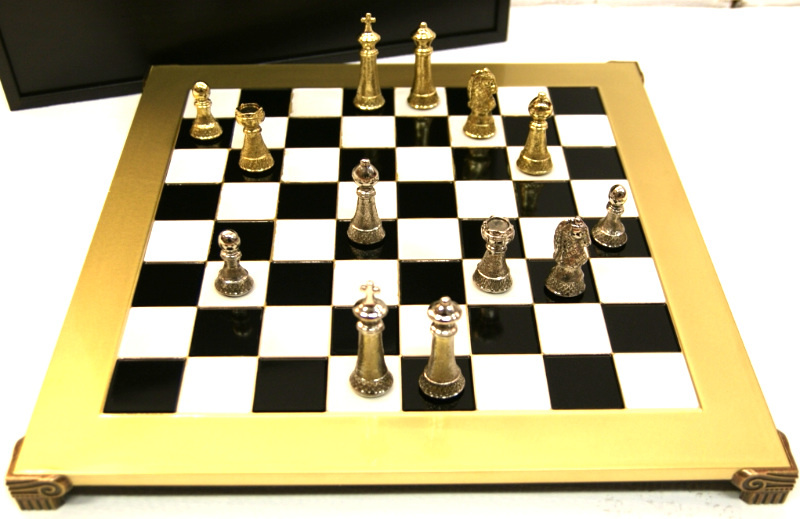 Schachbrett Bronze beschichtet 44 x 44, Felder schwarz/ weiss, Schachfiguren Gold und Silber aus Zink Aluminium Druckguss „Zamak 5“, Set in Holzbox