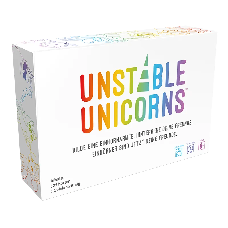 Unstable Unicorns ist ein strategisches Kartenspiel für 2–8 Spieler. Baut eure eigene Einhorn-Armee auf, schützt euren Stall mit Magie und sabotiert eure Gegner, um als Herrscher über alle magischen Dinge hervorzugehen!