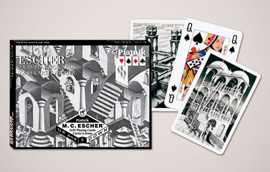 Doppelspiel von Piatnik Rückseite gestaltet, Vorderseite moderner Standard mit 4 Eckzeichen, 2 x 55 Spielkarten, 6 Joker, Kartengrösse 58 x 89 mm