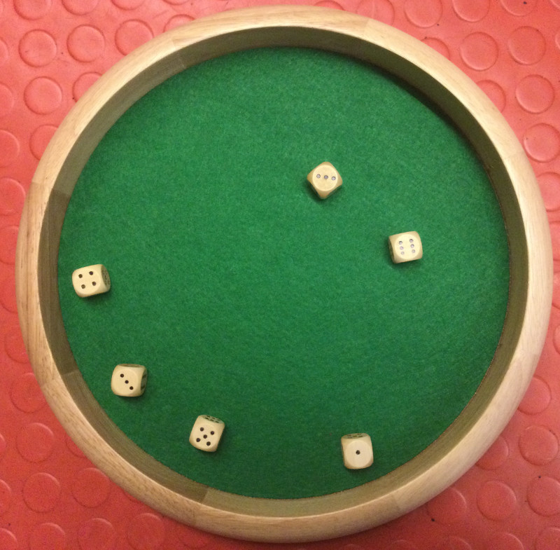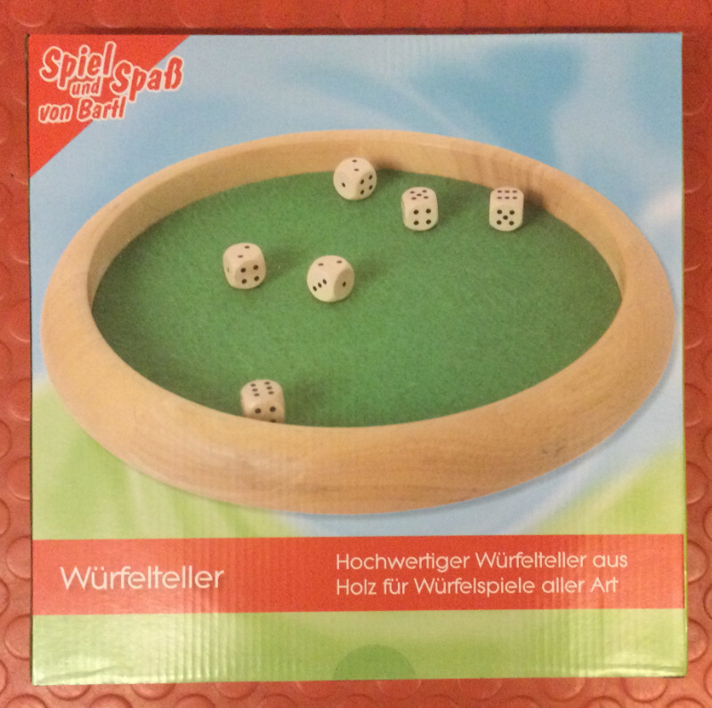 Hochwertiger Würfelteller aus Holz mit grünem Filzboden & Spielfläche, inclusive 6 Holzwürfel, im Karton verpackt.